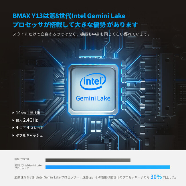 BMAX Y13はクアッドコアCPU「第8世代Intel Gemini LakeプロセッサN4100」を搭載。大きなメリットがあります。