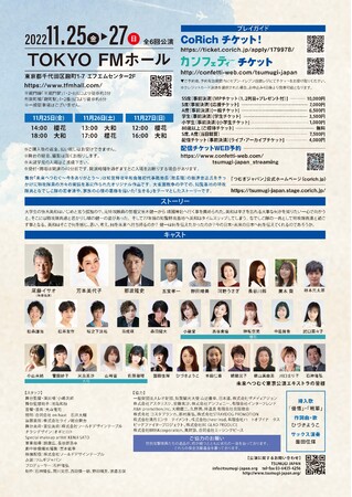 一般社団法人TSUMUGI JAPAN(東京都港区、代表:野田 憲晴)主催、『未来へつむぐ〜今をありがとう〜』が2022年11月25日 (金) 〜2022年11月27日 (日)にTOKYO FMホール(東京都千代田区麹町1-7FMセンター2F)にて上演されます。 チケットはカンフェティ(運営:ロングランプランニング株式会社、東京都新宿区、代表取締役:榑松 大剛)にて発売中です。