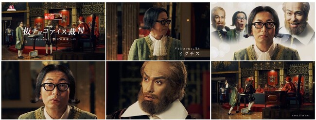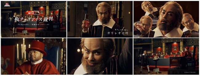 本動画では、ガリレオ・ガリレイが地動説を主張したことで行われた裁判を「板チョコアイス」で再現。世界でただ一人「地球は回っている」と唱えたガリレオ・ガリレイになぞらえ、世界でただ一人「板チョコアイスは、板チョコである」と唱える男・ガリレオの裁判の様子を描きました。大袈裟にナンセンスな主張をするガリレオを圧倒的な表現力で演じるのは北村一輝さん。また、裁判長役を髭男爵の山田ルイ53世さん、ガリレオの仲間役をひぐち君さんが担当します。
