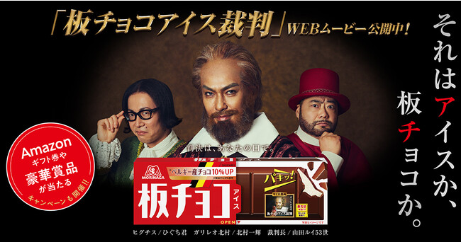 さらに10月4日(火)からは、「板チョコアイスはアイスか?板チョコか?」に対するあなたの判決をTwitterに投稿すると、板チョコアイス30個&ミニ冷凍庫がもらえるキャンペーンや、商品パッケージにあたりが出るとAmazonギフト券1,000円分がもらえるキャンペーンも実施します。