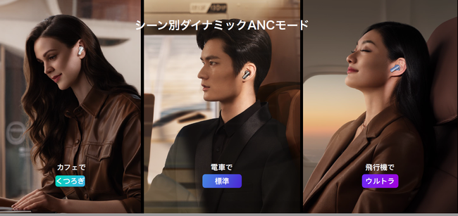 トリプルマイクによるアクティブノイズキャンセリングを搭載。2つのフィードフォワード、1つのフィードバックの高感度マイクがより正確な環境音と耳元の音の状況をリアルタイムに取得し、逆音波を発生させてノイズキャンセリングします。ノイズ除去の効果は前モデルを超えており、騒がしい場所や混雑した環境でも、自分の世界に没頭することが可能です。前モデルと比較して平均ノイズキャンセリング効果が15%アップしています※4。また、ダイナミックANCモードがONのとき、最適なノイズキャンセリングモードを自動で選択します。