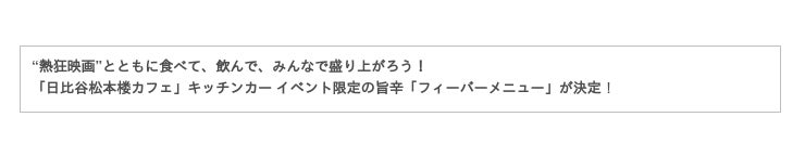 「日比谷松本楼カフェ」キッチンカーでは、本イベント限定の旨辛「フィーバーメニュー」の提供が決定しました。ヤンニョムチキンやスパイシーポテトなど、ここでしか食べられないイベント限定メニューに加え、生ビールなどのアルコール、ソフトドリンクも提供いたします。熱狂映画と共に「フィーバーメニュー」をぜひご賞味ください。