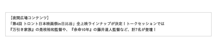 【タイトル】第4回トロント日本映画祭in日比谷