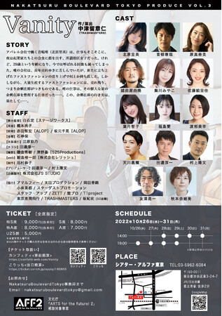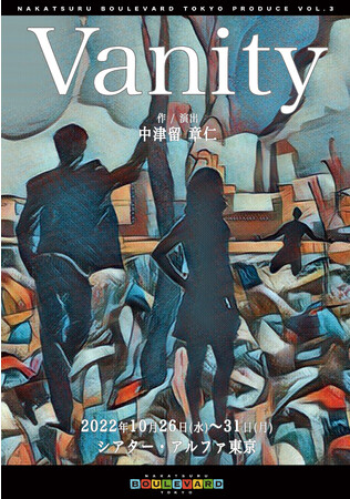 株式会社 J'S STUDIO主催、Nakatsuru Boulevard Tokyo Vol.3『Vanity』が2022年10月26日 (水) 〜2022年10月31日 (月)にシアター・アルファ東京(東京都渋谷区東3-24-7B1F)にて上演されます。 チケットはカンフェティ(運営:ロングランプランニング株式会社、東京都新宿区、代表取締役:榑松 大剛)にて発売中です。