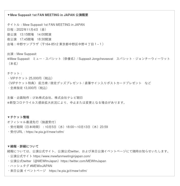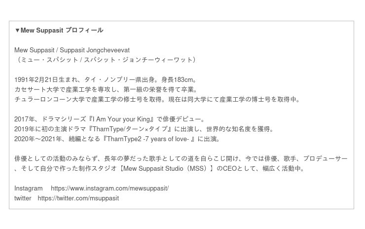 タイ出身人気俳優「Mew Suppasit (ミュー・スパシット)」2022年11月に初来日イベント決定!