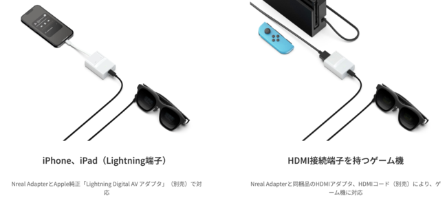 ※Nreal Adapterと同梱品のHDMIアダプタ、市販のHDMIコード(別売)により、HDMI入力を備えた一部のゲーム機に対応。現在Nintendo Switchのみテスト済み。
