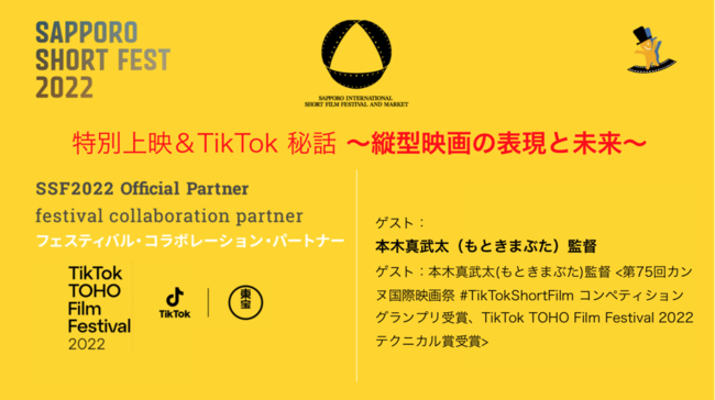 「最近は個人でも動画を簡単に撮影して映像をアップするSNS動画に注目が集まり、世界中の大勢の人が映像表現をすることが当たり前のようになっています。ショートフィルムは30分以内の映像であればジャンルを問わず世界中から応募され、最近では縦型動画の応募も目立ってきました。インターネットで映画を見る時代でもあり、時短時代の映像のあり方や鑑賞方法なども、ますます多様化してきています。そのような中で札幌国際短編映画祭は、縦型の映画制作をきっかけにこれからの映像・映画業界の可能性を支援していくプロジェクトであるTikTok TOHO Film Festivalとのコラボレーション企画を実施する事に決定致しました。映画祭開催期間中(10/10 15:30〜17:00)受賞作品の上映と、第75回カンヌ国際映画祭「#TikTokShortFilm コンペティション」グランプリ受賞:本木真武太(もときまぶた)監督をゲストに迎え、グランプリ受賞作品「Kitte kitte iino?(木って切っていいの?)」を上映すると共に、TikTokにおける縦型映画の撮影に関する秘話を語っていただきます。