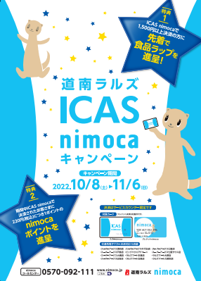 株式会社ニモカ(所在地:福岡県福岡市、代表取締役社長:田端敦)は、2022年10月8日(土)から11月6日(日)までの期間中、「道南ラルズ ICASnimocaでおトクにお買い物!」キャンペーンを実施いたします。 期間中、ICASnimoca電子マネーで決済された方を対象に、粗品のプレゼントや、nimocaポイントを進呈いたします。 『市電にも、函バスにも、お買い物にも使える便利でおトクな交通系ICカード「ICASnimoca」』で、快適なキャッシュレス生活をお楽しみください。