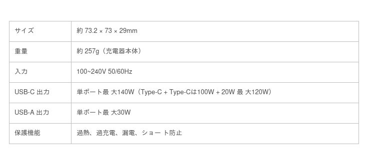 1ポート最 大140W出力で、iPhoneだけでなくタブレット端末やノートPCにも急速充電が可能です。Power Delivery 3.1に対応しているデバイスを100W以上のパワフルな充電速度が可能になりました。