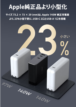 Macbook純正140W充電器と比べて23%の小型化を実現した上に、更に複数のポートを搭載。窒化ガリウム技術により、接続されるデバイスに認識し自動的に電力を配分し、安全に充電します。