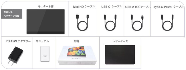 GeeMoni-X1には、必要なケーブル類が付属し、さらに、製品を保護しスタンド機能も搭載したPUレザーカバーが付属します。