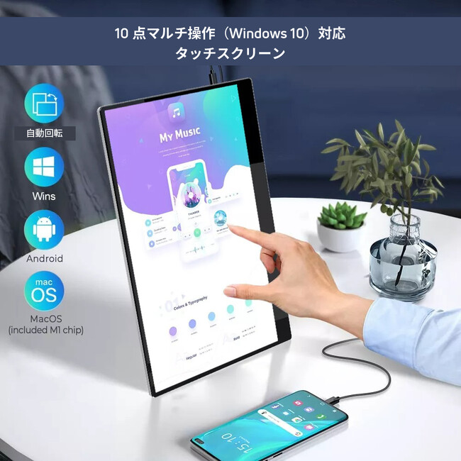 ※ お使いのデバイスは、HDMI出力、thunderbolt3.0またはUSB3.1 Gen2 Type C DP ALT-MODEに対応し、ビデオ出力およびタッチ用のポータブルモニターに対応する必要があります。デバイスによっては、USB-C充電のみに対応している場合があり、ご使用いただけない場合がございます。