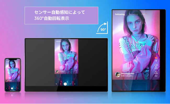 スマートフォンやラップトップに接続すると、モニターが製品の方向を感知し、製品の位置に応じてディスプレイを水平または垂直に自動的に切り替えます。