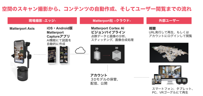 空間のスキャン撮影から、コンテンツの自動作成、そしてユーザー閲覧までの流れ