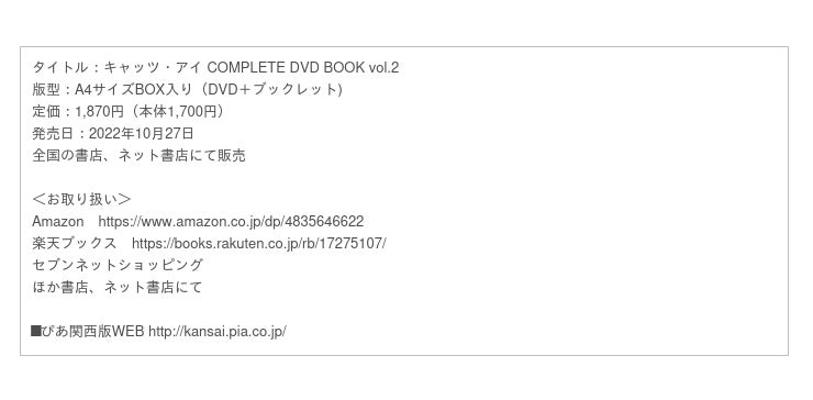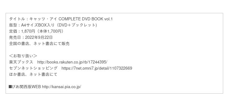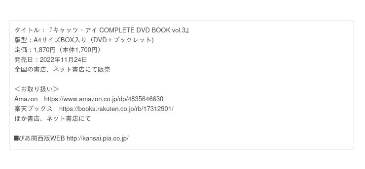 ぴあ株式会社より、『キャッツ・アイ COMPLETE DVD BOOK』全4巻が、9月22日より、月1ペースで刊行スタート。好評につき、11月24日に発売するvol.3の表紙を解禁。併せてネット書店での予約も開始します。