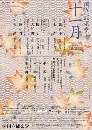 国立能楽堂(東京都渋谷区千駄ヶ谷4-18-1)の11月主催公演が下記の通り上演されます。 11月定例公演 悪太郎・羽衣 / 2022年11月9日(水)午後1時開演 11月普及公演 附子・大江山 / 2022年11月12日(土)午後1時開演 11月定例公演 樋の酒・天鼓 / 2022年11月18日(金)午後5時30分開演 11月企画公演 聖徳太子絵伝絵解き・夢殿 / 2022年11月24日(木)午後5時30分開演 11月企画公演 太子手鉾・弱法師 / 2022年11月30日(水)午後1時開演 チケットはカンフェティ(運営:ロングランプランニング株式会社、東京都新宿区、代表取締役:榑松 大剛)にて10月10日(月・祝)10:00より発売開始です。