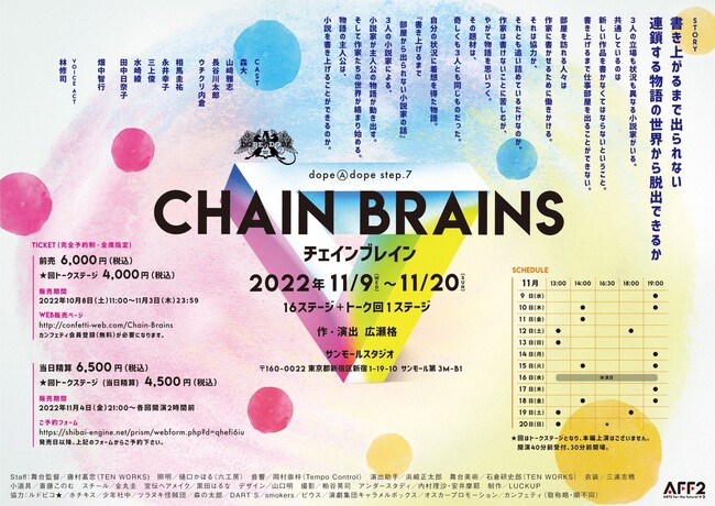 dopeAdope『チェインブレイン』が2022年11月9日(水)〜11月20日(日)にサンモールスタジオ(東京都練馬区)にて上演されます。チケットはカンフェティ(運営:ロングランプランニング株式会社、東京都新宿区、代表取締役:榑松 大剛)にて10月8日(土) 11:00 より発売開始です。