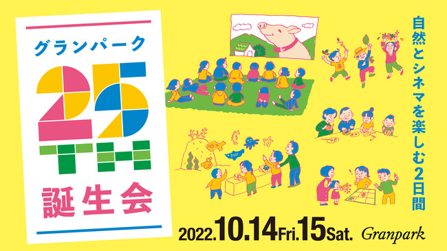 10/14(金)・10/15(土)の2日間、25周年の最後を飾るイベントとして「グランパーク25周年お誕生日会 ー自然とシネマを楽しむ2日間ー」を開催いたします。芝生の上での映画鑑賞や、自然に触れるワークショップなど、くつろいだ雰囲気のなか楽しいひとときをお過ごしください。