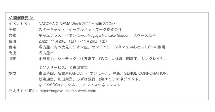スターキャット・ケーブルネットワーク株式会社(代表取締役社長:松下寿昭、本社:名古屋市中川区、以下 スターキャット)は、「SDGs未来都市 ※1」として持続可能なまちづくりを目指す名古屋市内の各地を会場に、11月20日(日)から11月26日(土)の日程で、「NAGOYA CINEMA Week 2022 〜with SDGs〜」を開催します。 映画を中心に地域の企業・団体・市民をつなぎ、SDGsに通じる感性を育むきっかけとなる名作、11作品を上映します。
