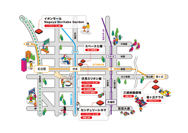 会期中は、「伏見ミリオン座」、「センチュリーシネマ」をメイン会場とし、「イオンモールNagoya Noritake Garden」「三越映画劇場」「星が丘テラス」「スペース七番」の4つのサテライト会場で、年齢・性別・障がい・人種・民族・格差・宗教を超えて感動を分かち合うことのできる11作品を上映する他、映画とSDGsを核とした様々なイベントを開催します。