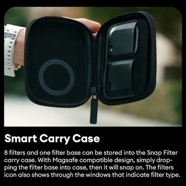 【内蔵磁気マウント】: 磁気設計で一秒で取付完了が可能です。Snap FilterベースをIphoneの背面に吸い込んで取付完了になります。