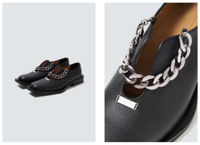 職人とMIKAGE SHINがミリ単位でこだわった繊細なスリットラインが、絶妙なヌケ感と色気とを演出。シューズのハードさを程よく抑え、より中性的でエレガントな印象に。また、MIKAGE SHINを象徴する繊細かつ大胆に配置されたシルバーチェーン&ネームプレートは、全体のバランスを引き締め、より洗練されたアーバンなムードを作り出します。