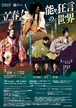 やまとみらい(大和市文化創造拠点等 指定管理者)主催、『立春!能・狂言の世界』が2023年2月18日 (土)にやまと芸術文化ホール メインホール(神奈川県大和市大和南1丁目8番1号)にて開催されます。初の公演を祝う、格式高い上演方式を採用。美しき「謡と舞」、可笑しみ溢れる「狂言」、静御前、平知盛、源義経、武蔵坊弁慶など、人気の高い人物が登場し、ドラマティックな「能」をお贈りします。 チケットはカンフェティ(運営:ロングランプランニング株式会社、東京都新宿区、代表取締役:榑松 大剛)にて発売中です。