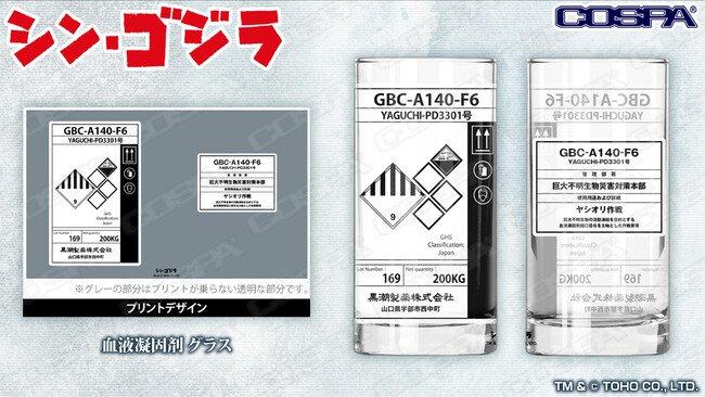 『シン・ゴジラ』作中にヤシオリ作戦に使用された「血液凝固剤」の容器ラベルをイメージしたグラスもラインアップ。