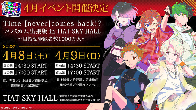 株式会社CRESTが展開するブランド『TRYSTAR(トライスター)』は、2023年4月8日(土)・9日(日)にオリジナル朗読劇<Time [never] comes back!?>(以下「ネバカム」)初のイベント「-ネバカム出張版-in TIAT SKY HALL 〜目指せ登録者数1000万人〜」(4月8日:14:30公演/17:00公演、4月9日:14:30公演/17:00公演、会場:TIAT SKY HALL)を開催いたします。ドラマCD封入先行チケット受付(抽選販売)は2022年11月5日(土)午前10時より開始となります。