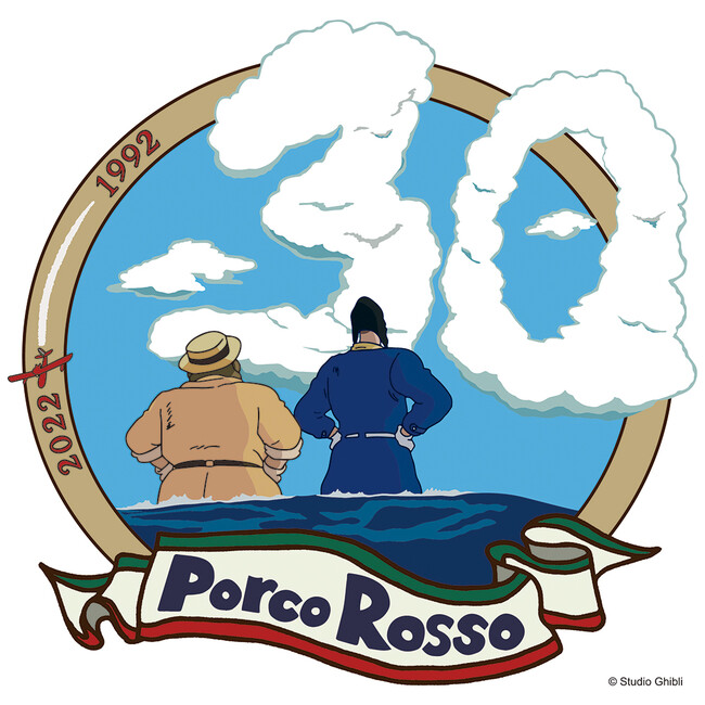 アドリア海の空に浮かぶ“30“の雲を眺め背中で語るポルコとカーチス。二人の飛行艇乗りの決闘を締めくくるシーンをモチーフに、イタリア国旗色のリボンに作品タイトルをあしらい、ポルコの愛機である”サボイアS-21“が1992から2022の数字を駆け抜けていきます。「カッコイイとは、こういうことさ。」という作品のキャッチコピーと情景を思い起こさせる、公開30周年限定のデザインです。