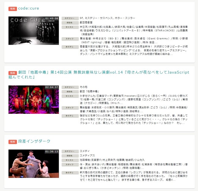 配信中の劇団には1982年に結成された「青年団」や「維新派」「柿喰う客」など有名な劇団から、各地の小劇場で活躍している劇団まで大小関わらず、演劇に特化しているのが特徴。