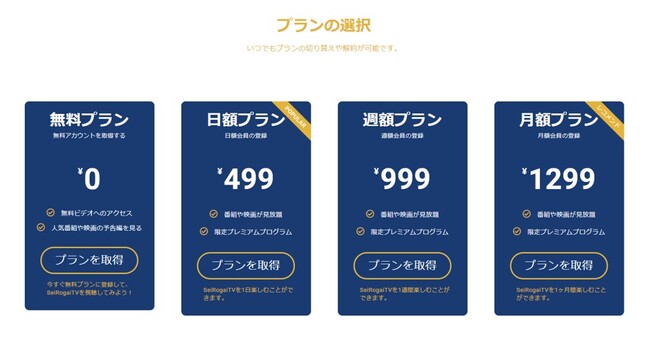 気軽に利用できる無料プランとともに、サブスクリプションプラン(有料:日額499円から)もご用意しております。有料プランでは、無料プランではアクセスできないプレミアムコンテンツをお楽しみいただけます。また、月額でなく日額のため、観たいときにワンコイン以下で24時間お好きなコンテンツを楽しめることも大きな魅力です。