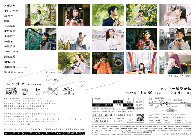 ムシラセ(代表:保坂萌)主催、『瞬きと閃光』が2022年11月30日 (水) 〜2022年12月4日 (日)にシアター風姿花伝(東京都新宿区中落合2-1-10)にて上演されます。チケットはカンフェティ(運営:ロングランプランニング株式会社、東京都新宿区、代表取締役:榑松 大剛)にて10月26日(水)12:00より発売開始です。