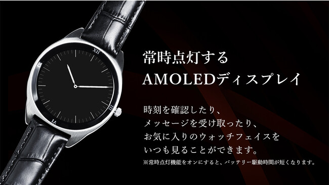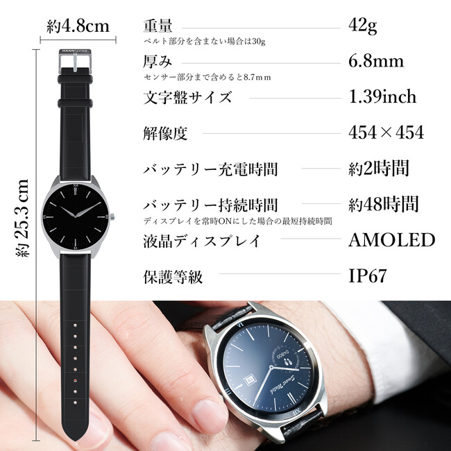 厚みが1cm以上もあるスマートウォッチが多いなか、特別なオリジナリティといえます。また、薄型&軽量でありながら、文字盤は1.39インチの大きめサイズで操作がしやすい点もうれしいポイント。