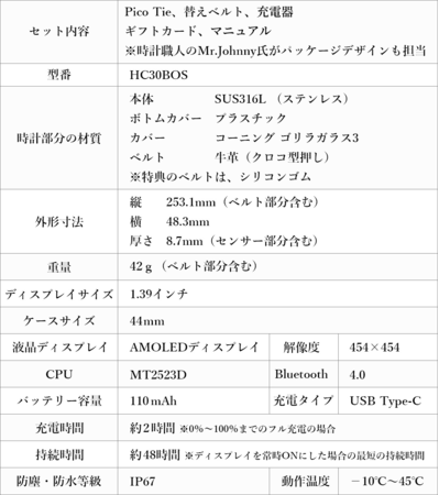 『Pico Tie』では、6.8mm※という薄さにとことんこだわりつつ、ベゼルにハイグレードなステンレス素材の「SUS316L」、カバーに高い透明度と強度を誇る「コーニング ゴリラ ガラス 3」を採用することでエレガントさを演出。