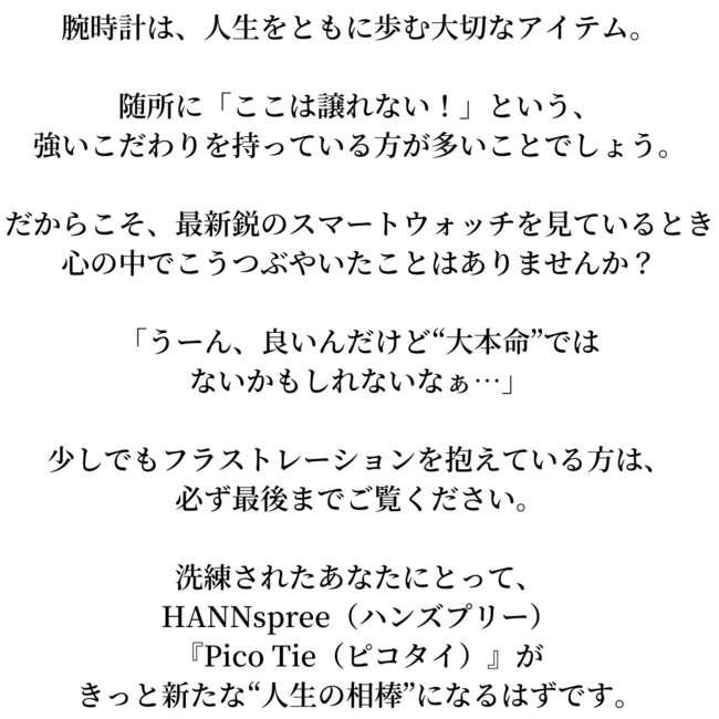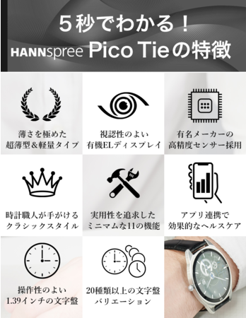 『Pico Tie』は、世界最大級の液晶メーカー・HannStar(ハンスター)が展開する、エレクトロニクスブランド・HANNspreeが手がけるスマートウォッチ。同ブランドの商品はスタイリッシュなルックスが特徴で、2002年の誕生以来、人気を得ています。