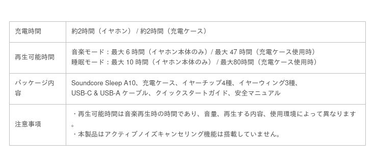 - 最大47時間の音楽再生:イヤホン本体が満充電の状態で最大6時間、付属のケースを合わせて使うと最大47時間の音楽再生が可能です。また、スリープミュージックをイヤホン自体にダウンロードすることで、最大10時間の使用もできます。