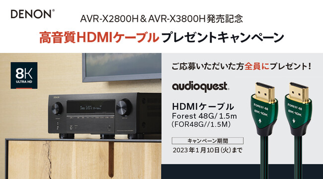 2022年10月28日(金)から2023年1月10日(火)までの対象購入期間中に、デノンの7.2ch AVレシーバー「AVR-X2800H」または9.4ch AVレシーバー「AVR-X3800H」をお買い上げの上、キャンペーンにご応募いただいた方全員にAudioQuestの高音質HDMIケーブル「Forest 48G / 1.5m」をプレゼントいたします。
