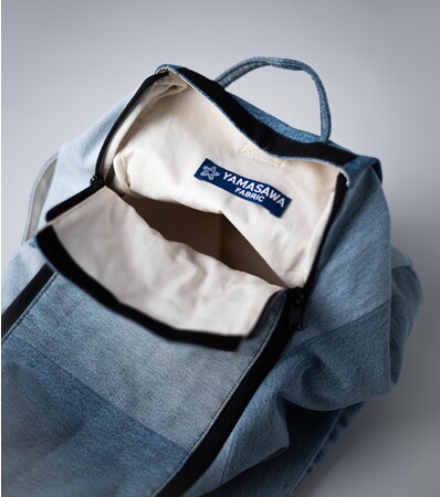 * 廃棄寸前だったデニムを蘇らせるプロジェクトを行なっているヤマサワプレスとコラボレーションしたオリジナルバッグ。使い込む程に風合いが増す経年変化も楽しめる。