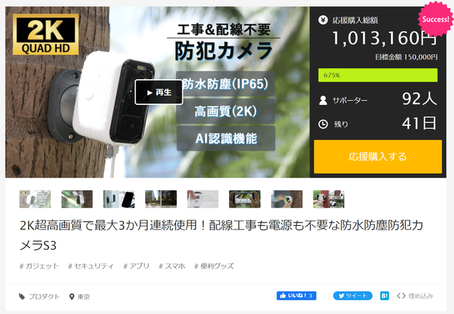 株式会社BRIGHT DIY(本社:埼玉県川口市)は、2K高画質/配線工事も電源も不要な防水防塵防犯カメラ「S3」を12/11(日)まで国内大手クラウドファンディングサイト"Makuake"で予約販売受付中です。