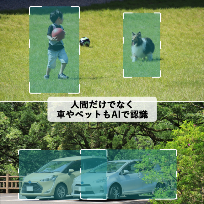 「スマートAI動体認識機能」:人、ペット、車を認識してスマホに通知!