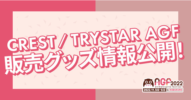 株式会社CREST(本社:東京都新宿区、代表取締役:三上政高/梁 俊模、以下「CREST」)は、2022年11月5日(土)、6日(日)に池袋・サンシャインシティ他にて開催される「アニメイトガールズフェスティバル(AGF)2022」へ出展いたします。当社ブースではMD事業部と女性向けブランド「TRYSTAR」の事業紹介に加え、限定グッズを販売。グッズをご購入いただいた方、キャンペーンにご参加いただいた方にはAGF特別デザインのオリジナルショッパーをプレゼントいたします。