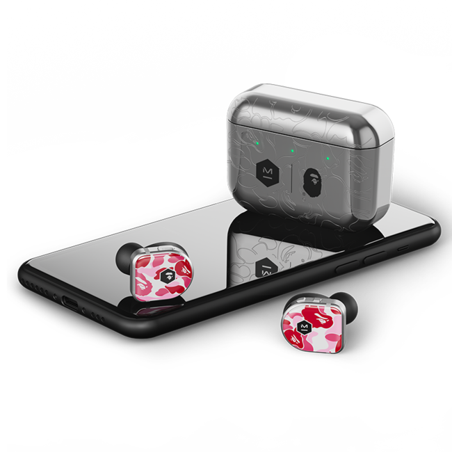 この限定コレクションでは、MG20 Wireless Gaming HeadphonesとMW08 Active Noise-Cancelling True Wireless Earphonesの2モデルにBAPE(R)の代表的なカモフラージュ柄である「ABC CAMO」のブルーとピンクが採用されています。