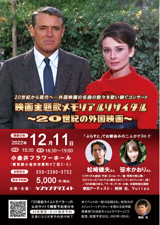 “昭和”をキーワードに面白アイテムの販売、情報発信、イベント開催を行う事業者であるケンケンクリエイト(所在地:東京都町田市、代表:糸柳貴陽)が、2022年12月11日(日)、音声配信番組「20世紀タイムトラベラー」とのクロスオーバーコンサートとして、「映画主題歌メモリアルリサイタル 20世紀の外国映画」を開催します。