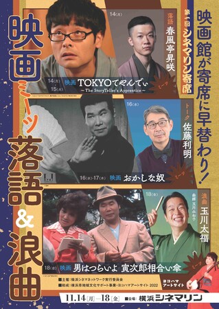 『男はつらいよ』を映画と浪曲で聞き比べ! 横浜シネマネットワークでは、11月14日[月]-11月18日[金]に横浜シネマリンにて第1回シネマリン寄席[映画ミーツ落語&浪曲]を開催いたします。寄席と言っても映画館ですので、映画を上映して、それに合った落語や浪曲、解説トークを日替わりで口演していただき、両方いっぺんに楽しんでいただこうという企画です。 記念すべき第1回目初日は、春風亭昇太原案の落語映画「TOKYOてやんでぃ」の上映とその弟子・春風亭昇咲の落語をお届け。 中日には、戦後の人気落語家の人生を渥美清が演じる隠れた名作『おかしな奴』の上映とおなじみ娯楽映画研究家・佐藤利明さんのトーク「落語と映画」。 そして千秋楽は「男はつらいよ」浪曲化シリーズ。寅さん最高傑作との呼び名も高い『寅次郎相合い傘』を玉川太福師匠の浪曲と映画で聞き比べ。 初日から千秋楽まで目が離せない5日間!ぜひ、貴媒体でのご紹介をお願いいたします。