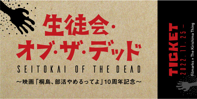 劇中で神木隆之介演じる映画部の前田涼也たちが撮影している自主制作映画には、実はタイトルがついており、それが「生徒会・オブ・ザ・デッド」。今回「もしこの映画の上映会があったら、こんなチケットだったかも?」というテーマでオリジナルチケットを作成しました。屋上で行われるクライマックスシーンの撮影日が11月29日(火)ということで、11月29日に来場された方”限定”で、「生徒会・オブ・ザ・デッド」のチケットを来場者特典として配布いたします。