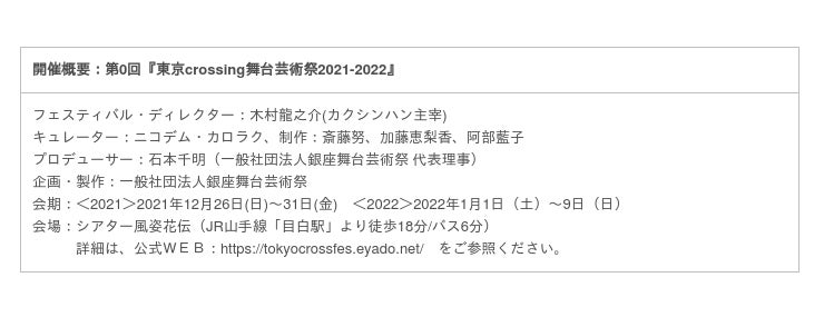 [文化庁 令和2年度第3次補正予算事業 ARTS for the future! 2次募集申請中事業]『東京crossing舞台芸術祭2021-2022』開催致します