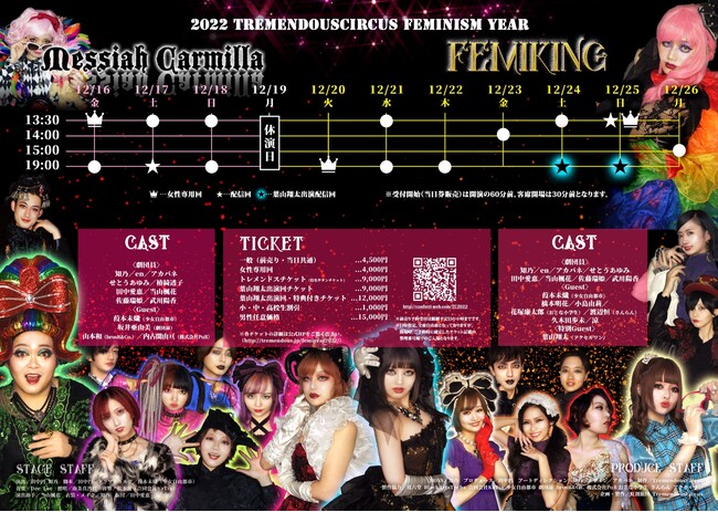 ※『メサイア・カーミラ』12月17日 (土)19:00、『Femiking』12月24日 (土)19:00、12月25日 (日)19:00の回にて、有料ライブ配信+2週間のアーカイブを予定しております。