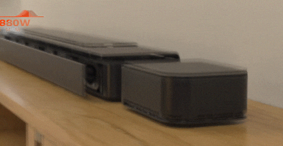 サウンドバー本体の両端に搭載したワイヤレス・リアスピーカーは着脱が可能です。本体から取り外し、視聴している場所の背後に設置するだけのアクションで、電源ケーブルやスピーカーケーブルなど一切のケーブル無しで、後ろから迫る音にも包まれ、映画館にいるかのような圧倒的な没入感を得られます。