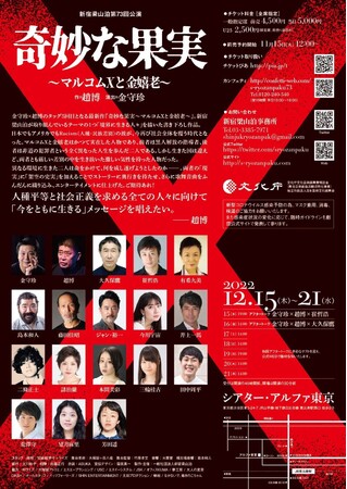 金守珍×趙博のタッグ5回目となる最新作『奇妙な果実〜マルコムXと金嬉老〜』。新宿梁山泊が取り組んでいるテーマの1つ「境界に生きる人々」を描いた書き下ろし作品。